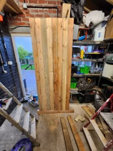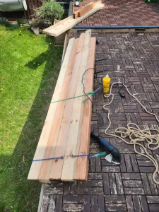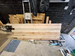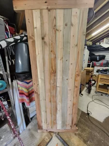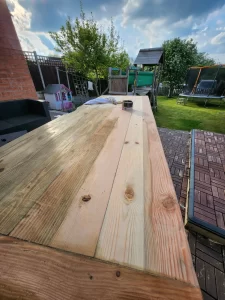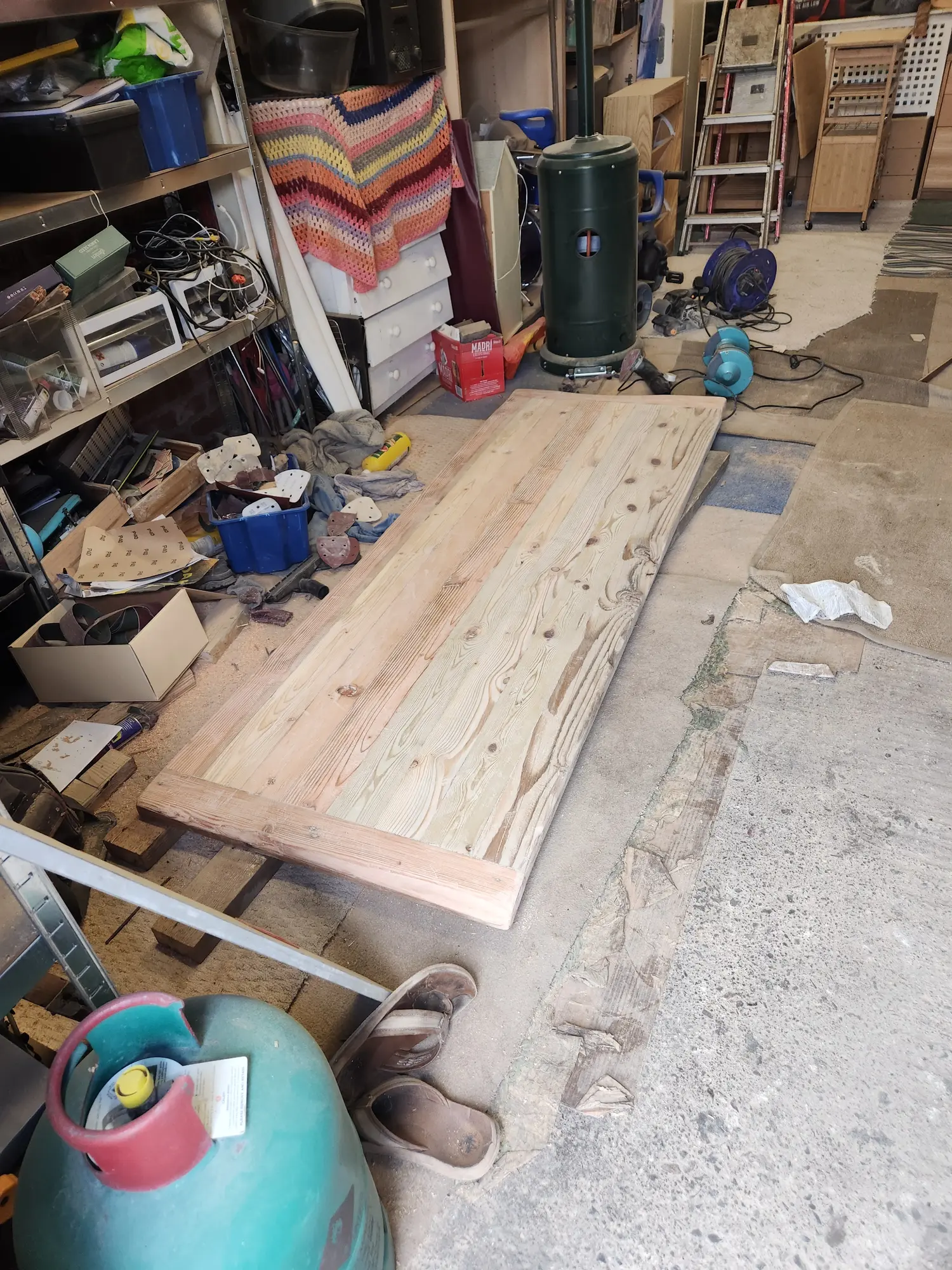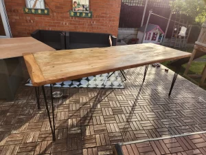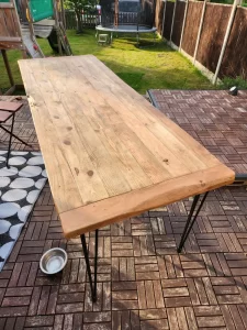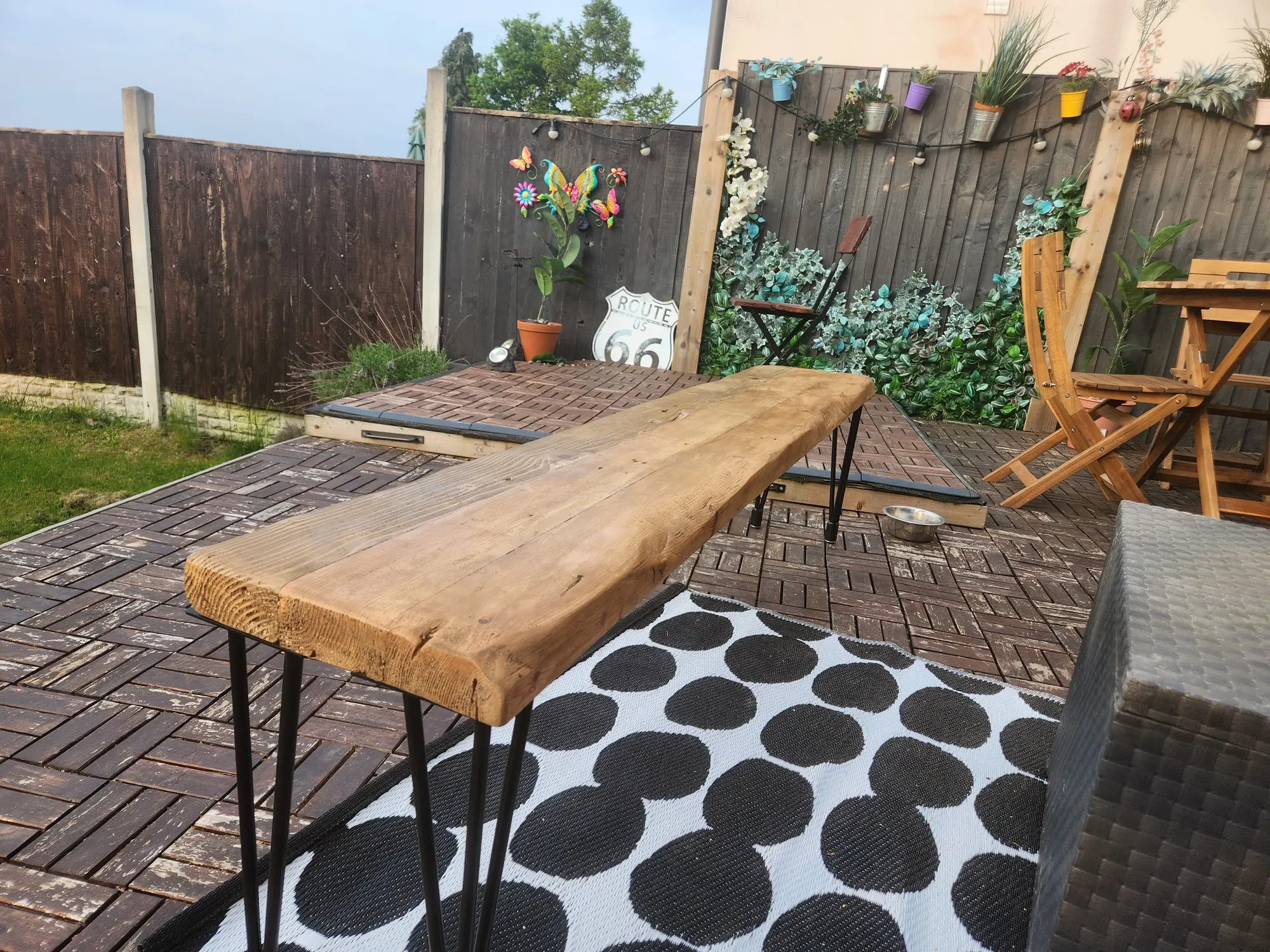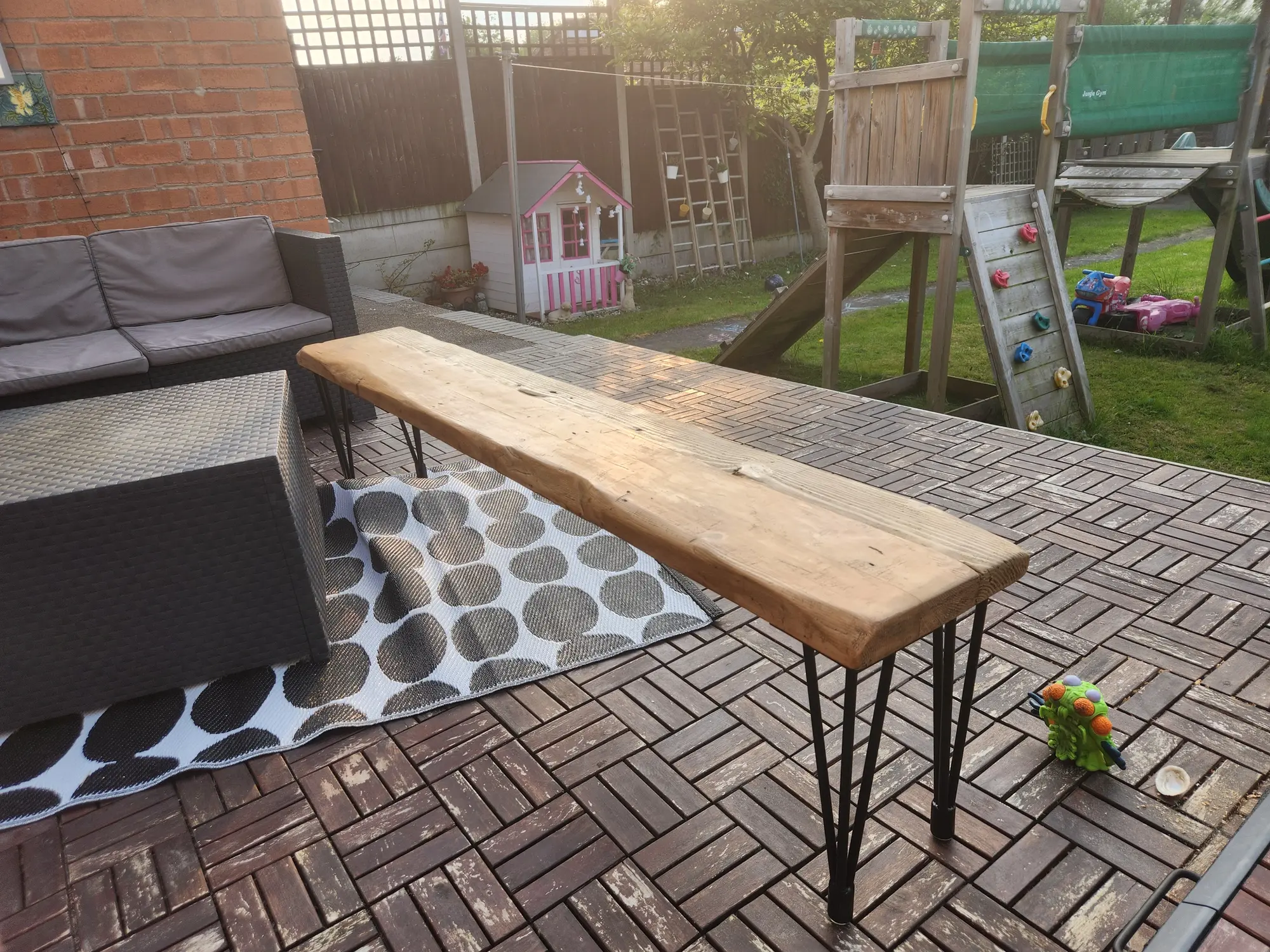 My first woodworking project, a Dining table made from reclaimed wood with adjustable spindle legs. Including a matching bench.